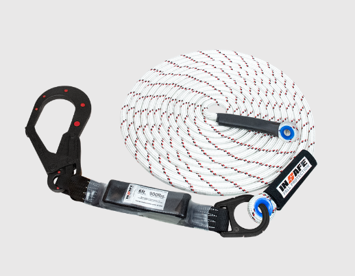Cuerda polyester de 14mm TRENZADA SEMIESTÁTICA con gancho 2¼ DIELÉCTRICO en un extremo y ponchado en ojalete plástico y termoformado negro al otro extremo para suspender el contrapeso. Es usado como parte de un sistema de detención de caídas con Absorbedor de Energía.